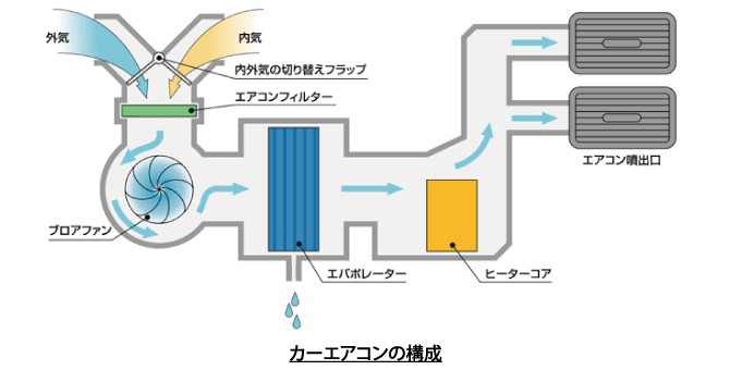 車内の空気や、外の空気がエアコンフィルターを通ってエバポレーターで空気を冷やして車内に冷えた空気を送るのが車のエアコンの仕組みです。